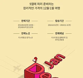 이스타항공 EASTAR JET 정기노선 항공권 특가소식 12월, 1월 출발 얼리버드 항공권 9월에 미리 준비하는 합리적인 가격의 12월/1월 여행 이스타's Early Bird ※ 판매기간 2018.09.01(토) 14:00 ~ 2018.09.07(금) 23:59 ※ 탑승기간 2018.12.01(토) ~ 2019.01.31(목) ※ 가격정보(편도총액) 김포/청주/군산/부산-제주 17,900원~ 도쿄 85,900원~ 후쿠오카 99,900원~ 오사카 75,900원~ 가고시마 85,900원~ 미야자키 85,900원~ 삿포로 94,900원~ 오키나와 99,900원~ 홍콩 89,900원~ 타이베이(타오위안) 99,900원~ 방콕 145,900원~ 하노이 125,900원~ 다낭 133,900원~ 코타키나발루 159..
